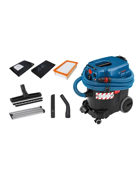 Le GAS 35 H AFC Professional est un aspirateur eau et poussière haute performance offrant une excellente protection de l’utilisateur. Certifié pour les poussières de classe H, donc les poussières cancérigènes et pathogènes, il retient 99,995 % des poussières dangereuses pour la santé. Il est également efficace sur les moisissures et les fibres de verre. Avec sa turbine de 1 380 W avec dépression de 254 mbar, l’aspirateur Bosch dispose d’un pouvoir aspirant élevé.